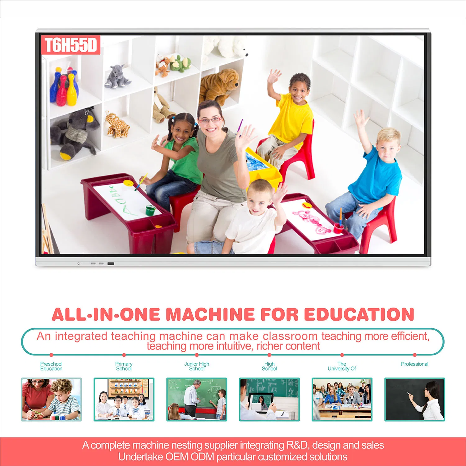 T6 series 55 inch LCD Display Smart Office Digital All-in-One PC Electric Educational Equipment Touch Screen Interactive Whiteboard For Preschool educationProduct introduction:This inch touch smart Whiteboard,It integrates TV, stereo, computer, projector, electronic whiteboard and tablet computer. U......